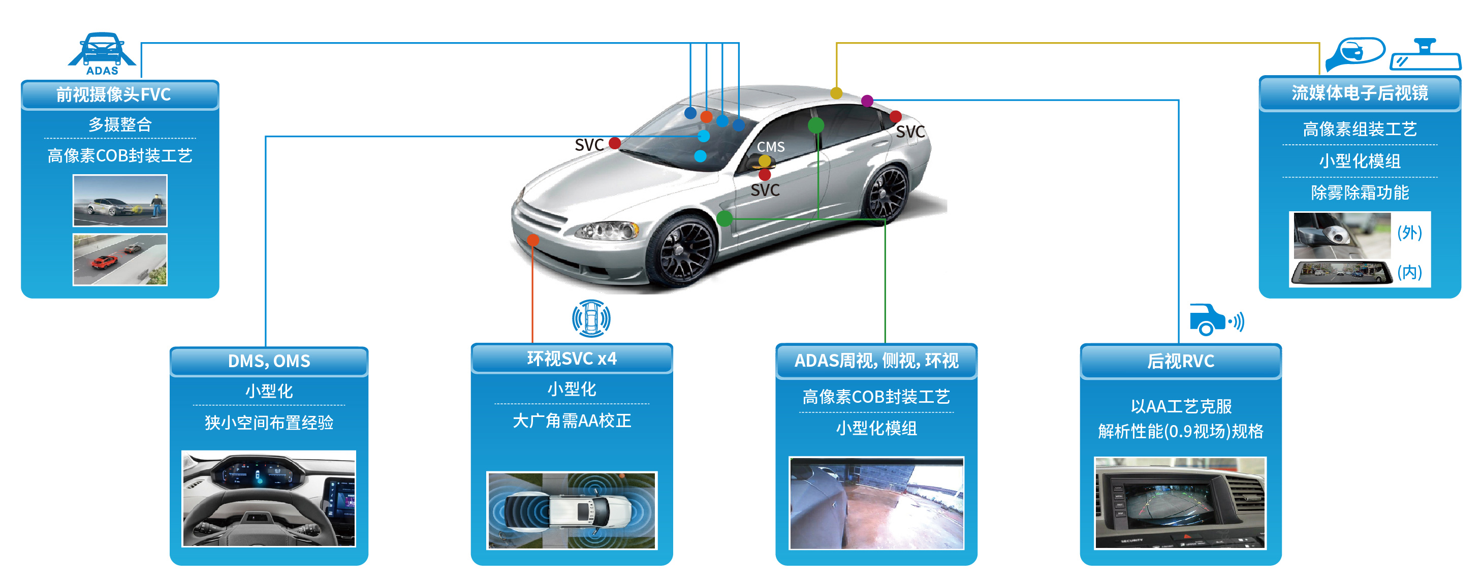 传感器方面:公司为客户提供全套摄像头解决方案,包含:前视,侧视,环视,电子外后视(CMS),驾驶员监控(DMS),乘客监控(OMS)等。产品覆盖1M-8M,48M车顶云台及12M、17M高像素产品即将量产。